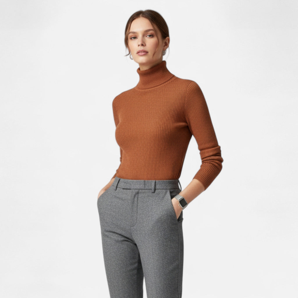- Zrównoważony wygląd: golf tworzy wrażenie proporcji i porządku, nadając całości klasyczny, ale nie przesadny charakter. Dzięki temu sweter można łączyć zarówno z klasycznymi spodniami, jak i ze spódnicami, tworząc różnorodne stylizacje.